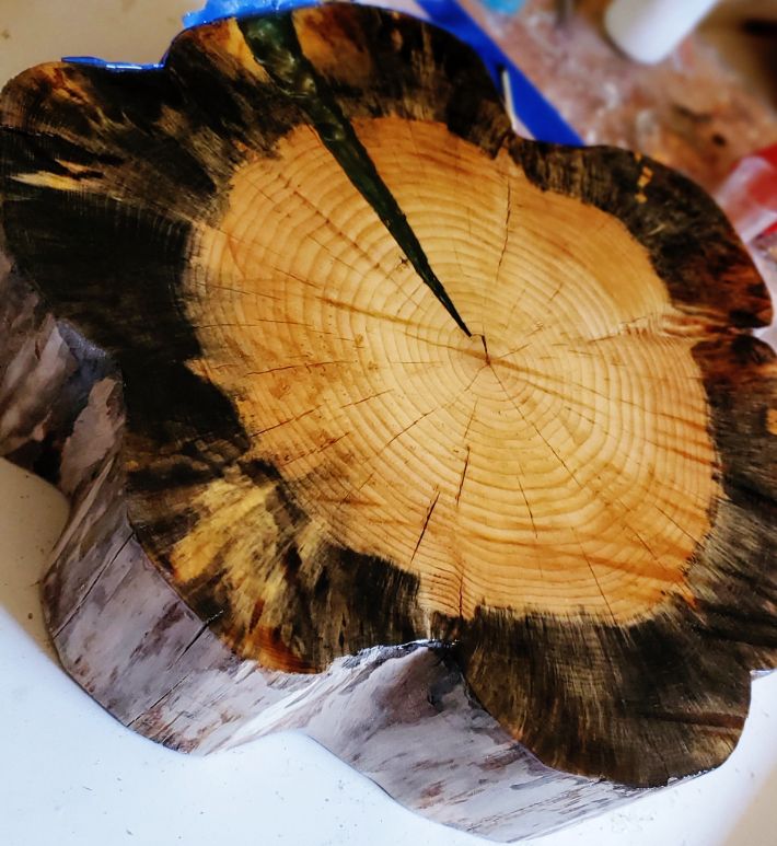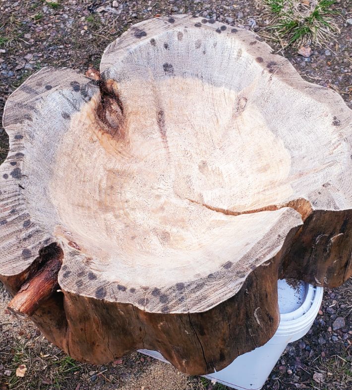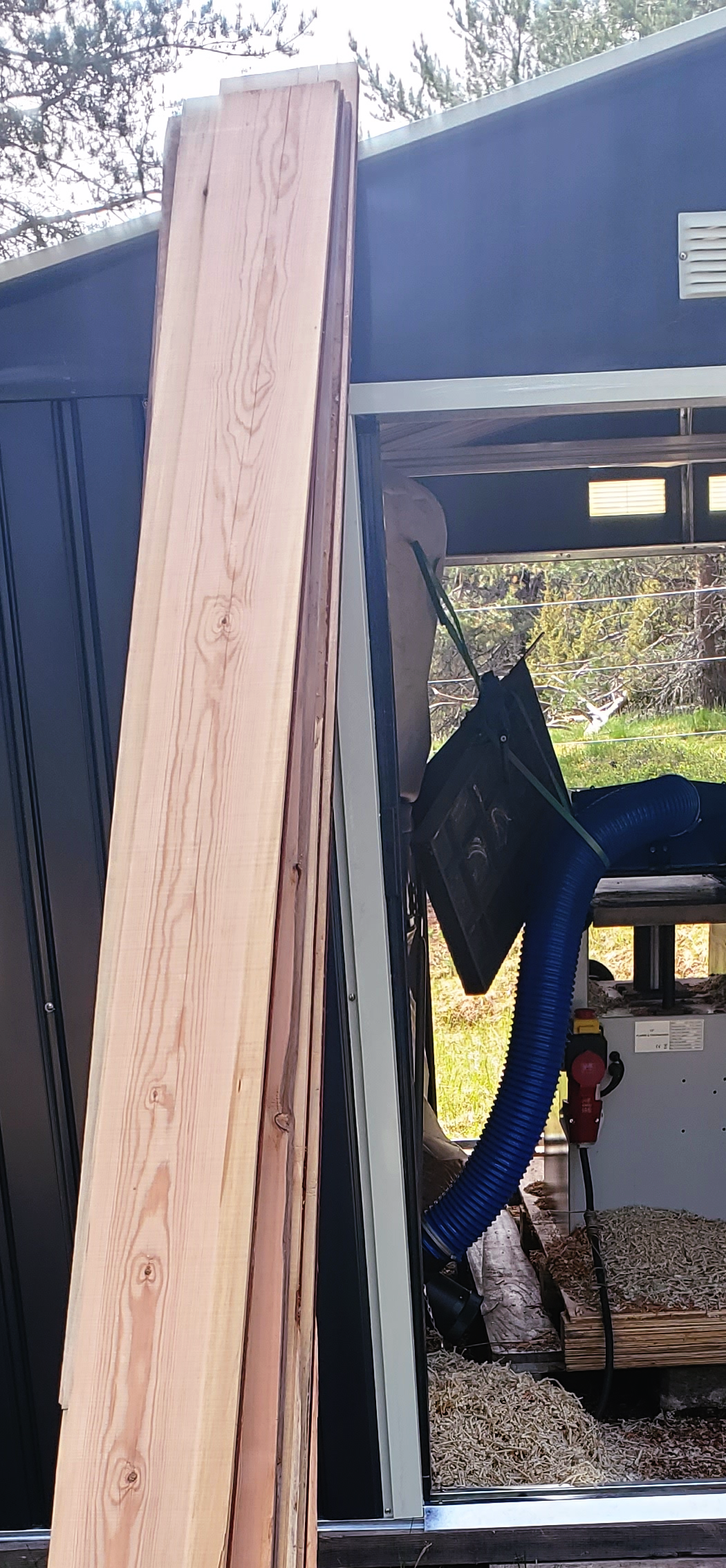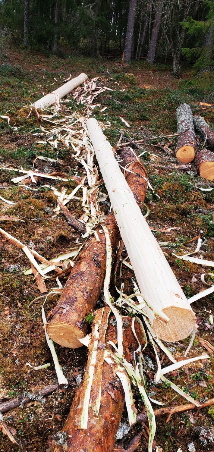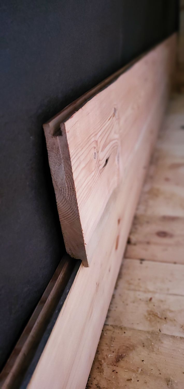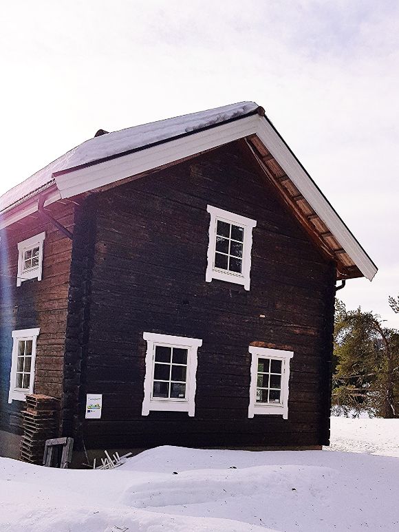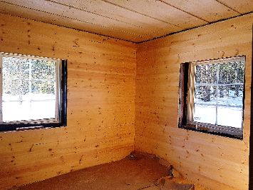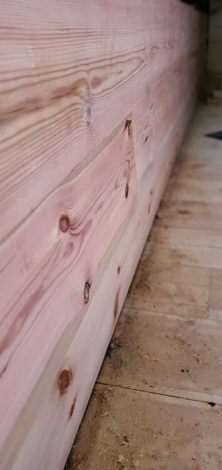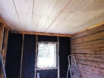 Viktigt att stryka på dalbränd trätjära på timret. Fönster inmonterade och egen design på fönsterfoder.